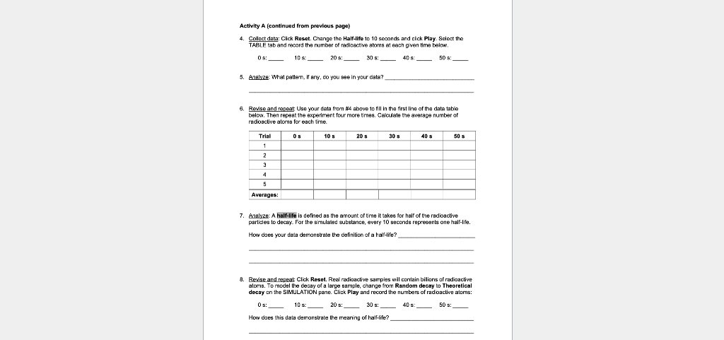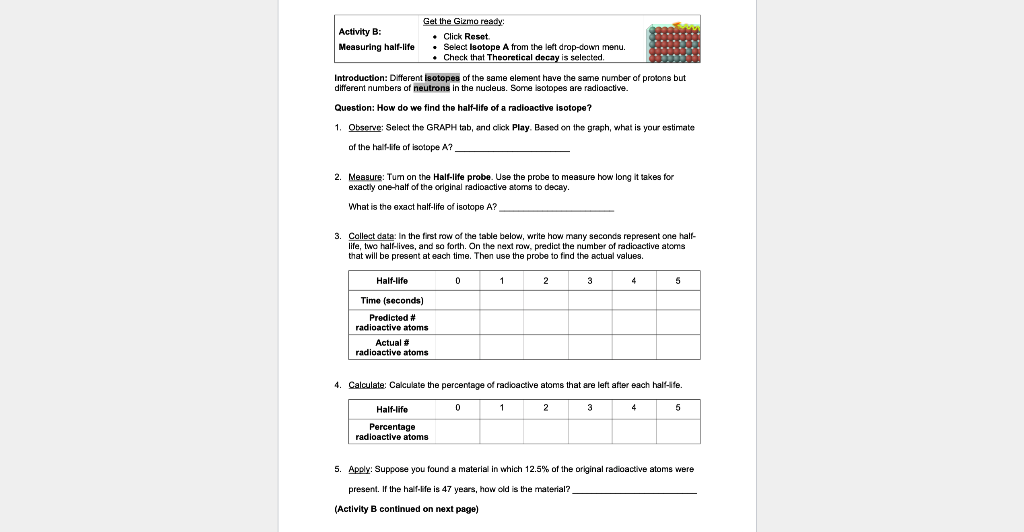 Data can be interpreted visually using a dynamic graph, a bar chart, and a table. Cell division gizmo answer key free : Half life gizmo answer key activity b half life gizmo quiz answers. Scribd is the world's largest social reading and publishing site. Guided reading activity 10 1 answer key. Which group approaches zero unstable atoms first? Student exploration half life gizmo answers ncpdev. Raven nodded towards a chair, shoved forward a box of cigars, and silently studied his. (answers can vary but the energy needed to vaporize the sample should be greater that. The time required for one of the radioactive atoms in a sample to decay. Worksheets on the reproductive system for kids Student exploration half life gizmo answers ncpdev. Half life gizmo activity 1 do not write on this paperrecord all answers on the answer sheet everything around you is made of atoms including plants course hero.